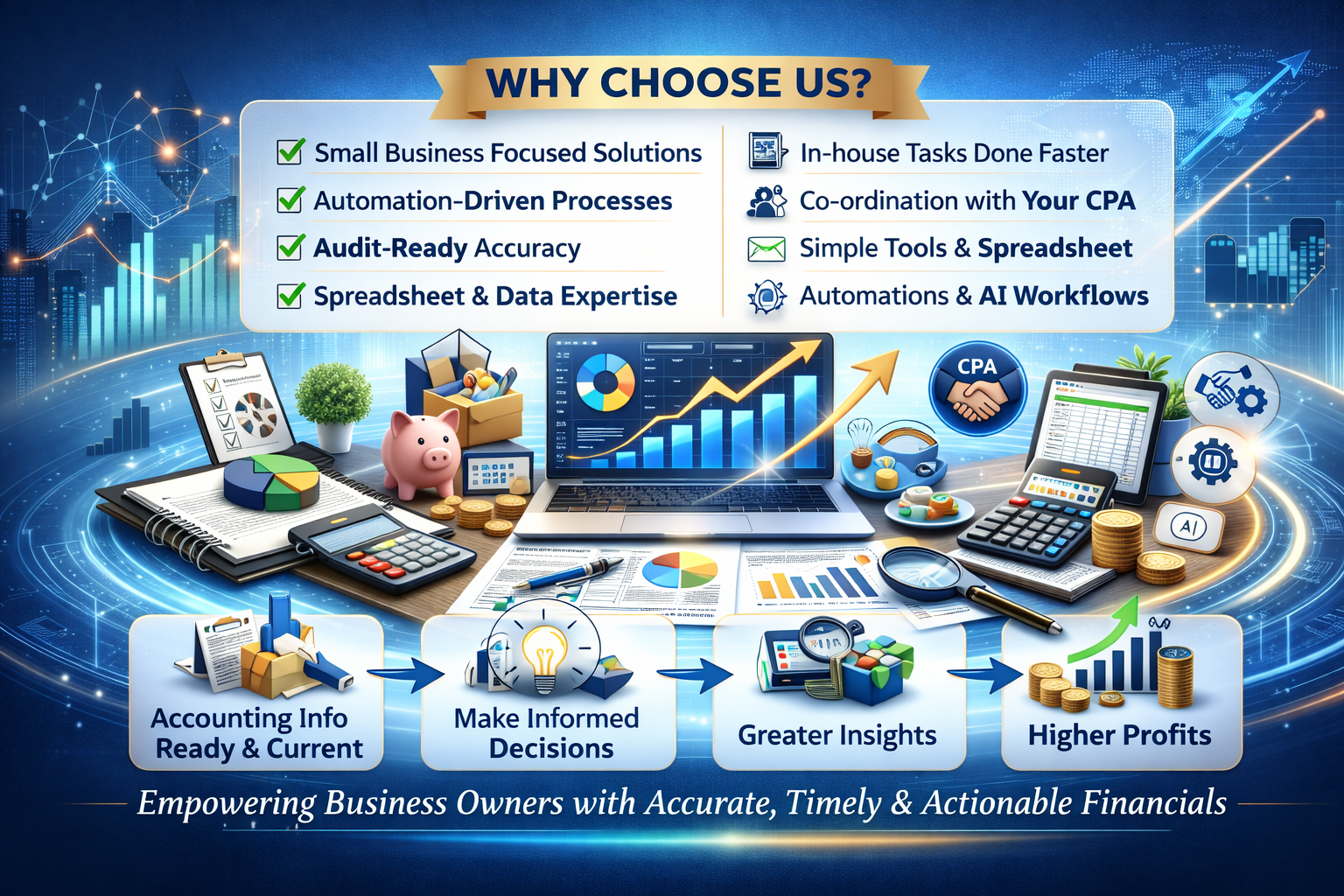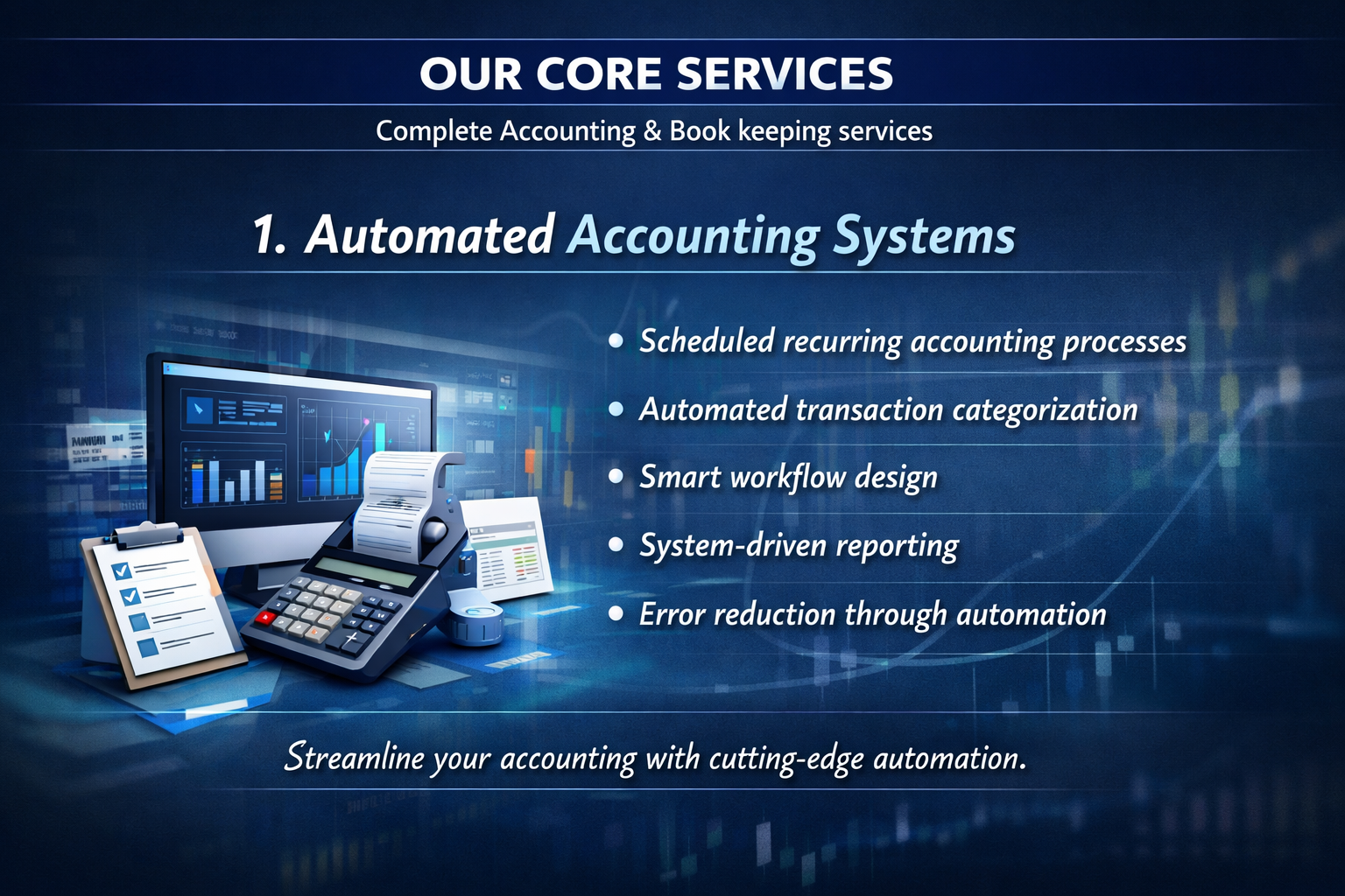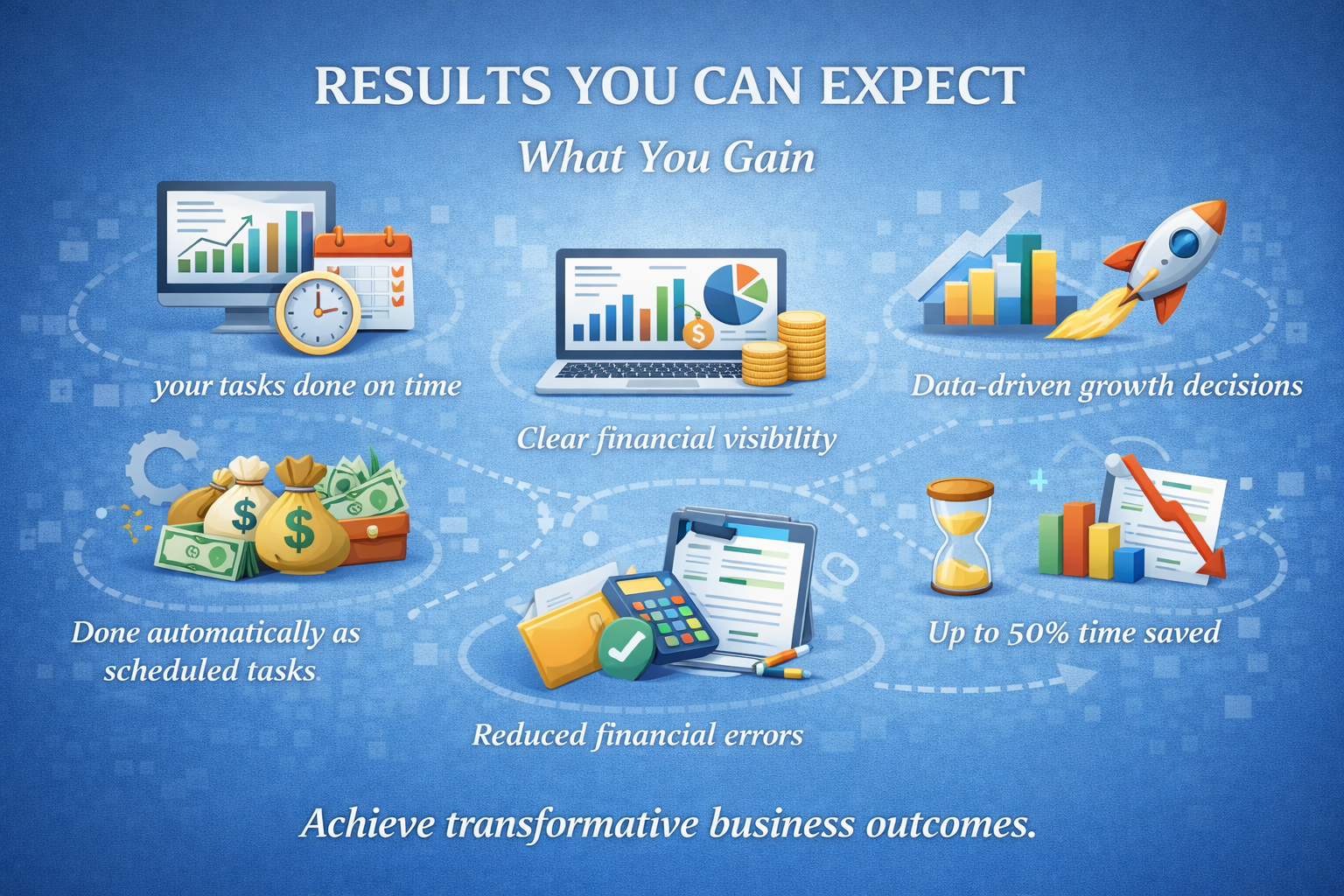 We streamline your bookkeeping, automate recurring processes, and deliver financial insights that help you scale confidently and profitably.